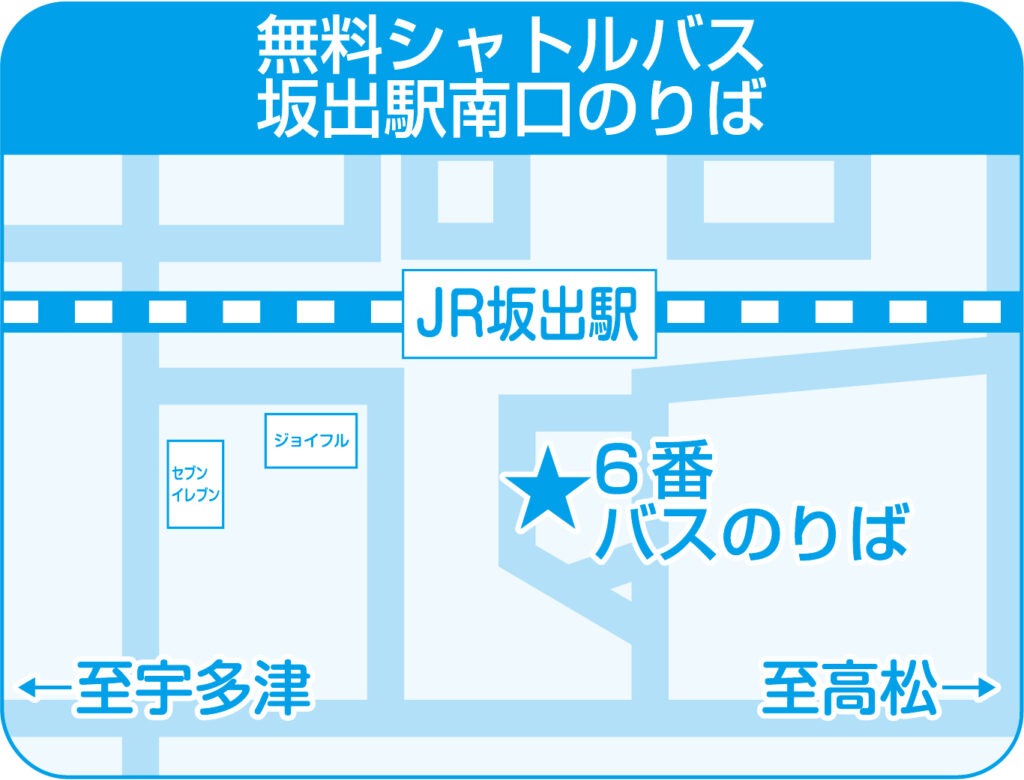 3/1~【JR坂出駅】レオマ無料シャトルバス乗降場変更のお知らせ 2026.2.25 2026年3月1日より、JR坂出駅レオマ無料シャトルバスの乗降場が、JR坂出駅北口から南口に変わります。ご注意ください。 ▼JR坂出駅南口6番乗り場・新バスターミナル(※2026年2月28日までのご利用の方は、JR坂出駅北口乗り場となります。) レオマ無料シャトルバス【JR坂出・宇多津・ことでん岡田便】の時刻表はこちら